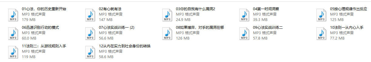 石勇12节大课《心法》炼就人生顶级能力 男生课程 课程目录: 01心法,你的历史重新开始.mp3 02有心就有法.mp3 03你的自我有什么漏洞2.mp3 04第一时间洞察.mp3 05按心理规律作出反应.mp3 06迅速识别行动的模式.mp3 07心法实战训练一 (2).mp3 08如果博弈,对手的漏洞在哪.mp3 09心法实战训练二.mp3 10法则一从内心入手.mp3 11法则二:从游戏规则入手.mp3 12从内在实力到社会身份的转换.mp3 资源下载下载价格9.9 救援币VIP免费立即购买遇到任何问题点击联系右下角在线客服,看到会第一时间解决问题。 0 其他课程