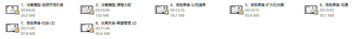 冷爱《告别单身与长期关系管理》 男生课程 课程目录: 1、冷爱模型-视频开场引读.mp4 2、冷爱模型-课程大纲.mp4 4、告别单身-认知清单.mp4 5、告别单身-扩大社交圈.mp4 6、告别单身-沟通.mp4 7、告别单身-约会 (2).mp4 8、长期关系-期望管理 (2).mp4 资源下载下载价格9.9 救援币VIP免费立即购买遇到任何问题点击联系右下角在线客服,看到会第一时间解决问题。 0 男生课程