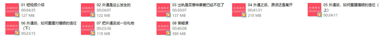周梵《当婚姻遇上忠诚挑战怎么办?》外遇是这么发生的 视频课程 男生课程 课程目录: 01 短视频介绍.mp4 02 外遇是这么发生的.mp4 03 出轨是否意味着爱已经不在了.mp4 04 外遇之后,原谅还是离开.mp4 05 外遇后,如何重建婚姻的信任(上).mp4 06 外遇后,如何重建对婚姻的信任(下).mp4 07 把外遇变成一份礼物.mp4 08 答疑课.mp4 资源下载下载价格9.9 救援币VIP免费立即购买遇到任何问题点击联系右下角在线客服,看到会第一时间解决问题。 0 其他课程