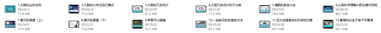 琳子博士《脑科学顶层思维课》(12节持续更新) 其他课程 课程目录: 1.大脑的丛林法则.mp4 2.大脑的分布式运行模式.mp4 3.大脑的冗余设计.mp4 4.大脑冗余设计的子分类.mp4 5.催眠的前世今生.mp4 6.从脑科学理解AI职业替代风险.mp4 7.意识在哪里(上).mp4 8.意识在哪里(下).mp4 9.声音可以镇痛.mp4 10.一些前沿的抗衰老方法.mp4 11.压力加速衰老的机制和对策.mp4 12.繁殖和长生不老不可兼得.mp4 资源下载下载价格9.9 救援币VIP免费立即购买遇到任何问题点击联系右下角在线客服,看到会第一时间解决问题。 0