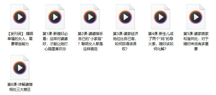 婆媳圣经:聪明女人都是这样搞定婆婆的! 其他课程 课程目录: 【发刊词】 婚姻幸福的女人,需要哪些能力.mp3 第1课-新媳妇必看:这样对婆婆好,才能让她打心眼里喜欢你.mp3 第2课-婆婆插手自己的“小家庭”?聪明女人都是这样搞定.mp3 第3课-婆家经济地位比自己高,如何获得话语权?.mp3 第4课-新生儿成了两个“妈”的导火索,媳妇该如何化解?.mp3 第5课-婆家娘家和谐共处,对于媳妇来说有多重要.mp3 第6课-详解婆媳相处三大禁区.mp3 资源下载下载价格9.9 救援币VIP免费立即购买遇到任何问题点击联系右下角在线客服,看到会第一时间解决问题。 0